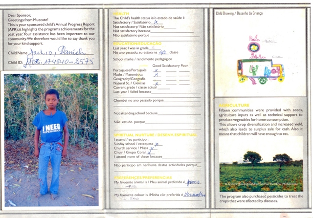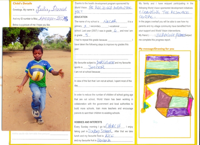 Im 2005 haben wir uns für eine Patenschaft von "World Vision" entschlossen. Unser Patenkind heisst Julio Daniel und kommt aus Mozambique.